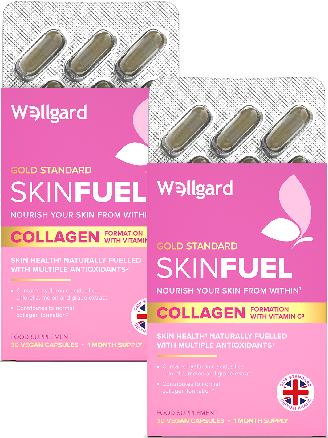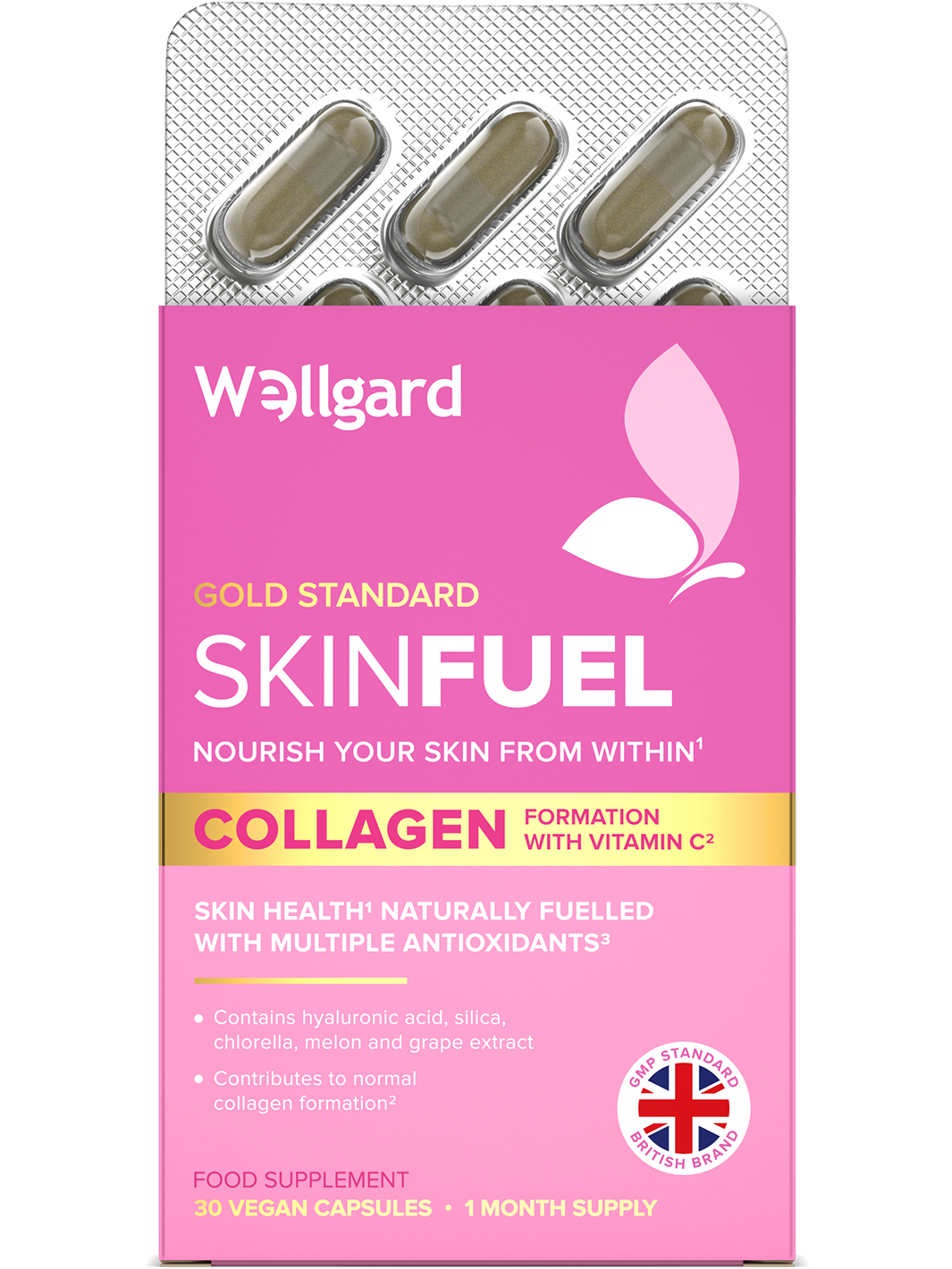 Wellgard Skin Fuel DOES NOT contain collagen as an ingredient, the formula naturally supports your body's own collagen production.